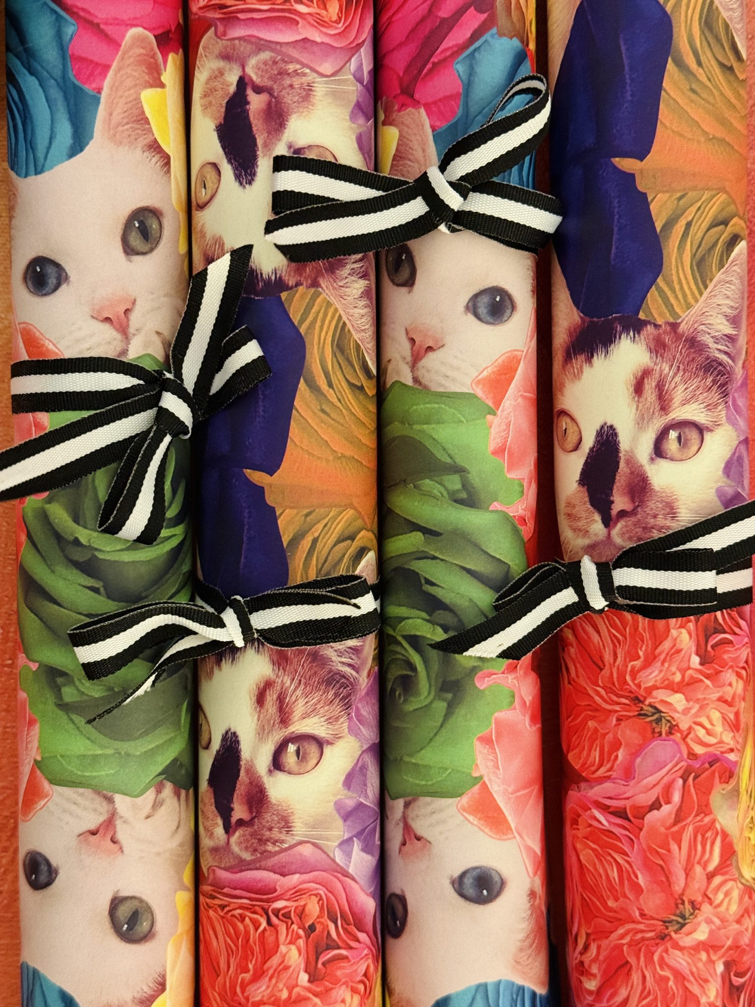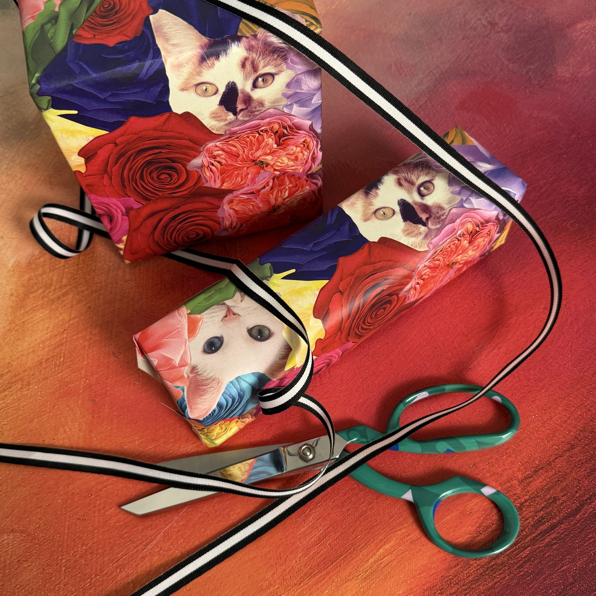 Life is a bed of roses for Betty and Rosbif, and never more so than on these luxury wrapping paper sheets! Printed in glorious colour onto crisp, matt-finish 120gsm paper, these sheets are sturdy enough to make wrapping a dream (a floral dream with cats, which is one of the best you can have).  There are also matching ribboned gift tags.